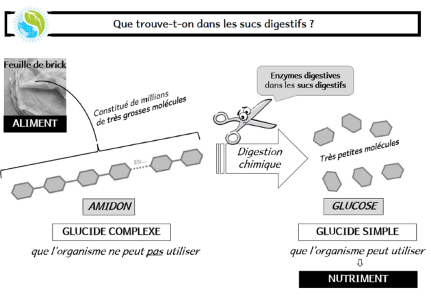 La digestion chimique, réalisée par les sucs digestifs permet de transformer les aliments en nutriments : petites molécules solubles que l’organisme peut utiliser (comme le glucose, sucre simple).