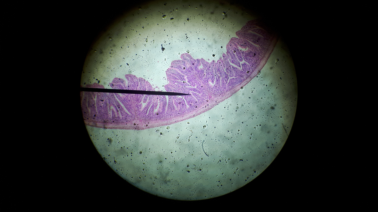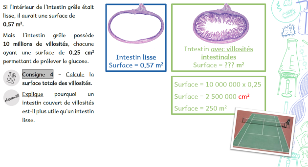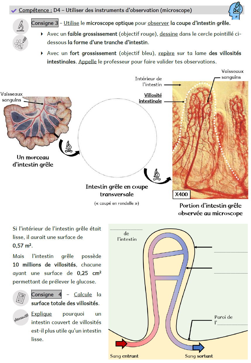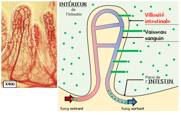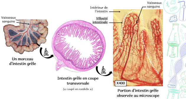 L’intestin grêle possède de nombreux replis : les villosités intestinales, à l’intérieur desquelles se trouvent de nombreux vaisseaux sanguins. Cela permet d’augmenter la surface d’échange de l’intestin.
