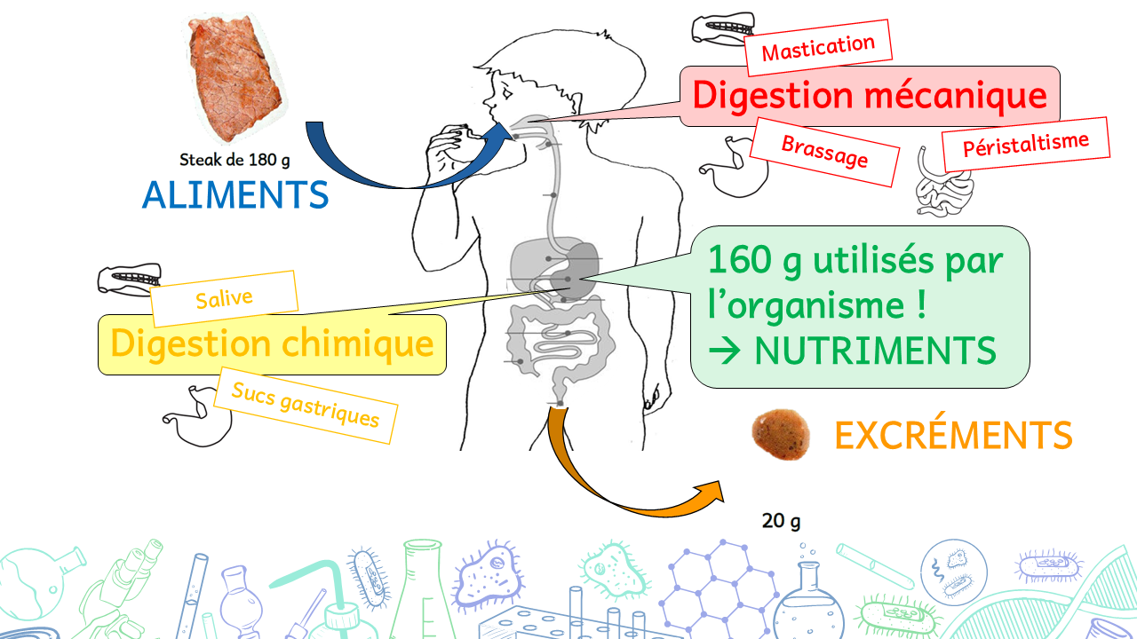 Des actions mécaniques et chimiques permettent de les transformer en excréments (rejetés) et en nutriments, qui seront utilisés par l’organisme.