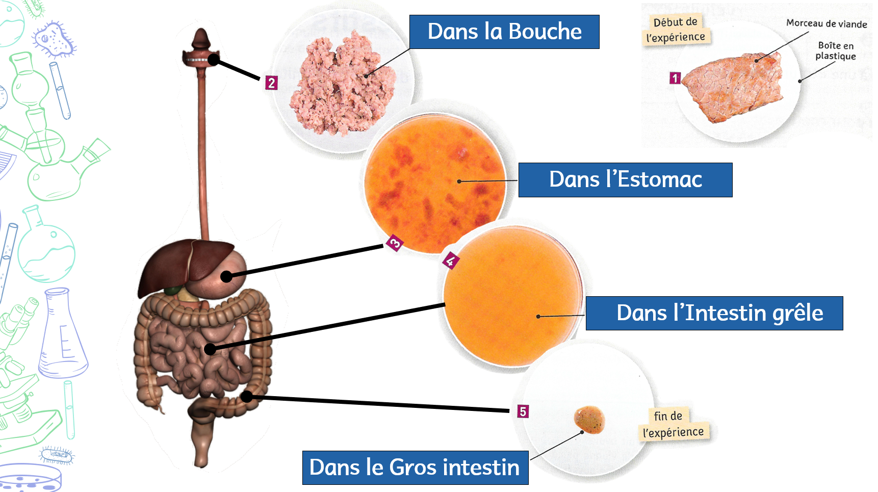 Les sucs digestifs contiennent des enzymes digestives, qui permettent de transformer des molécules complexes en molécules simples plus petites.