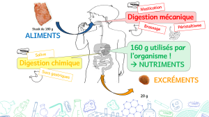 La digestion chimique, réalisée par les sucs digestifs permet de transformer les aliments en nutriments : petites molécules solubles que l’organisme peut utiliser (comme le glucose, sucre simple).