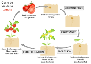 Puis des fleurs apparaissent (floraison) et se transforment en fruits (fructification) contenant des graines qui pourront germer à leur tour !