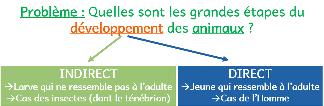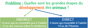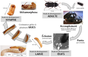 Les insectes ont un développement indirect. Les adultes s’accouplent puis la femelle pond des œufs qui éclosent pour libérer des larves. La croissance des larves s’effectue progressivement par des mues nombreuses. On obtient enfin une nymphe qui se métamorphosera en adulte (apparition des yeux, ailes…) !