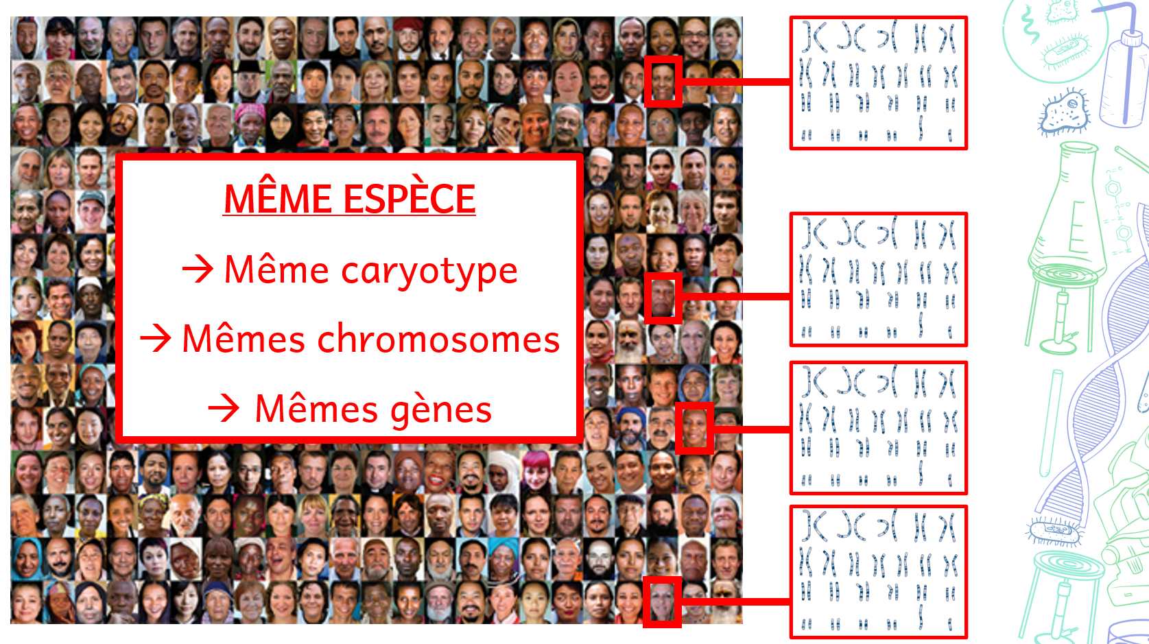 Tous les individus d’une même espèce (par exemple les humains) possèdent le même caryotype constitué de 46 chromosomes. Ces 46 chromosomes portent les mêmes 20 000 à 25 000 gènes aux mêmes emplacements, et cela est conservé depuis l’existence de notre espèce (soit depuis environ 300 000 ans).