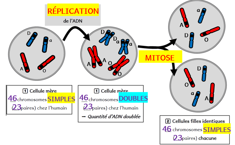Avant de réaliser la mitose, chaque molécule d’ADN constituant un chromosome est recopiée. Les chromosomes simples deviennent donc doubles (ils possèdent alors chacun 2 chromatides identiques). C’est la réplication de l’ADN.