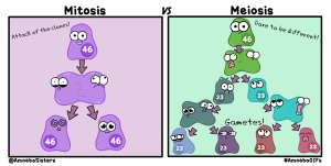 Lors de la mitose, les chromosomes doubles se séparent en deux parties identiques, et chaque cellule fille reçoit un lot complet de chromosomes simples. Toutes les cellules de l’organisme (sauf les cellules reproductrices) possèdent ainsi une copie complète de l’ensemble des informations génétiques portées par l’ensemble des chromosomes du caryotype.