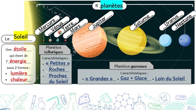 Notre système solaire est un ensemble de 8 planètes qui gravitent autour de l’une de ces étoile : le Soleil. Le Soleil produit de l’énergie (lumière et chaleur).