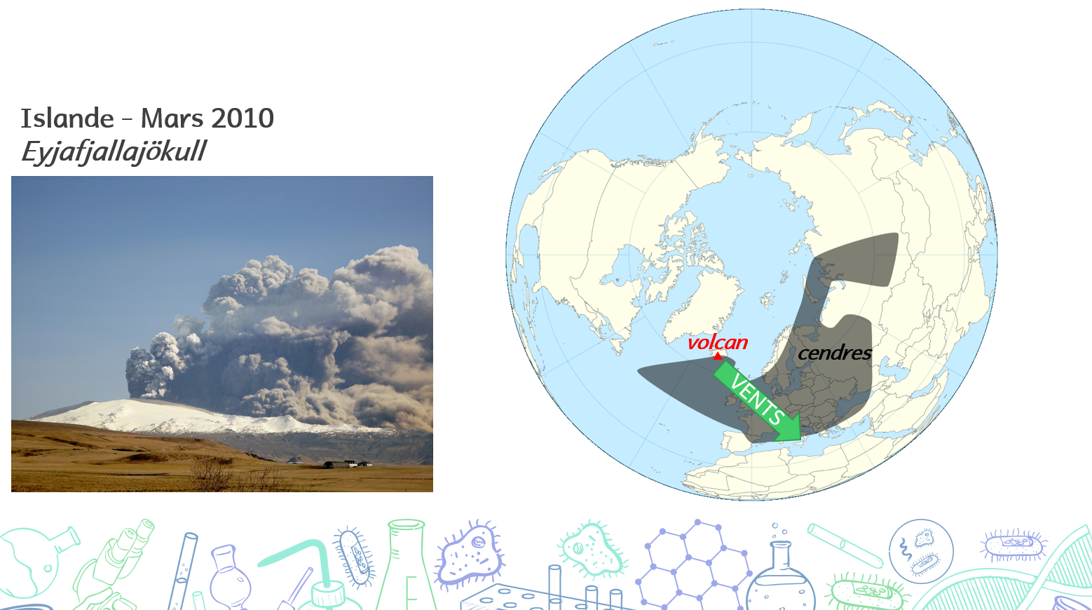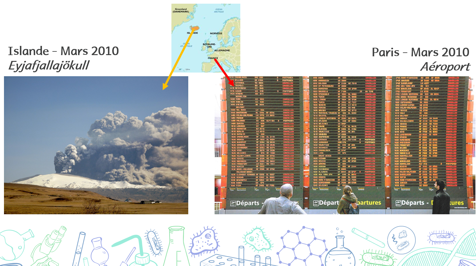 En 2010, un volcan islandais au nom difficile à prononcer entre en éruption. Il libère dans le ciel un grand panache composé en particulier de cendres en suspension.
