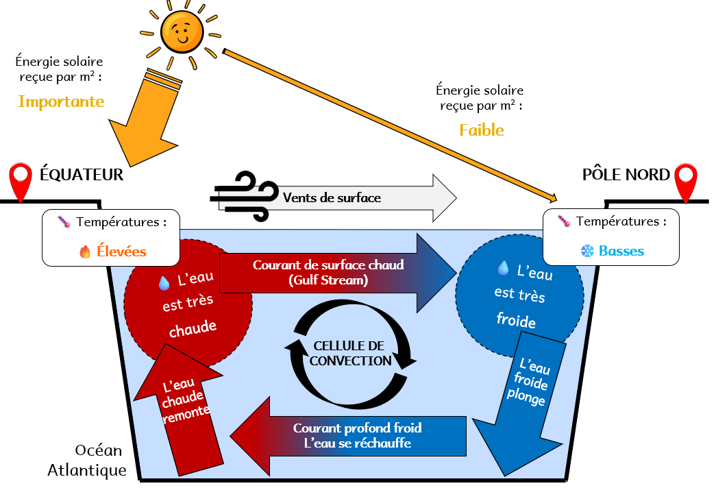L’ensemble de ces mouvements d’eau s’appelle une cellule de convection : les courants marins redistribuent la chaleur et modifient localement les climats.