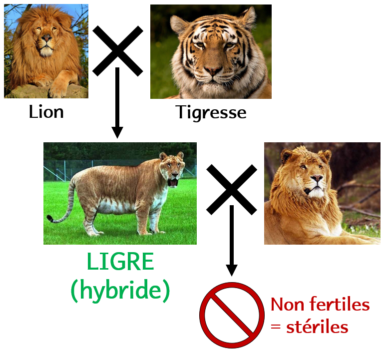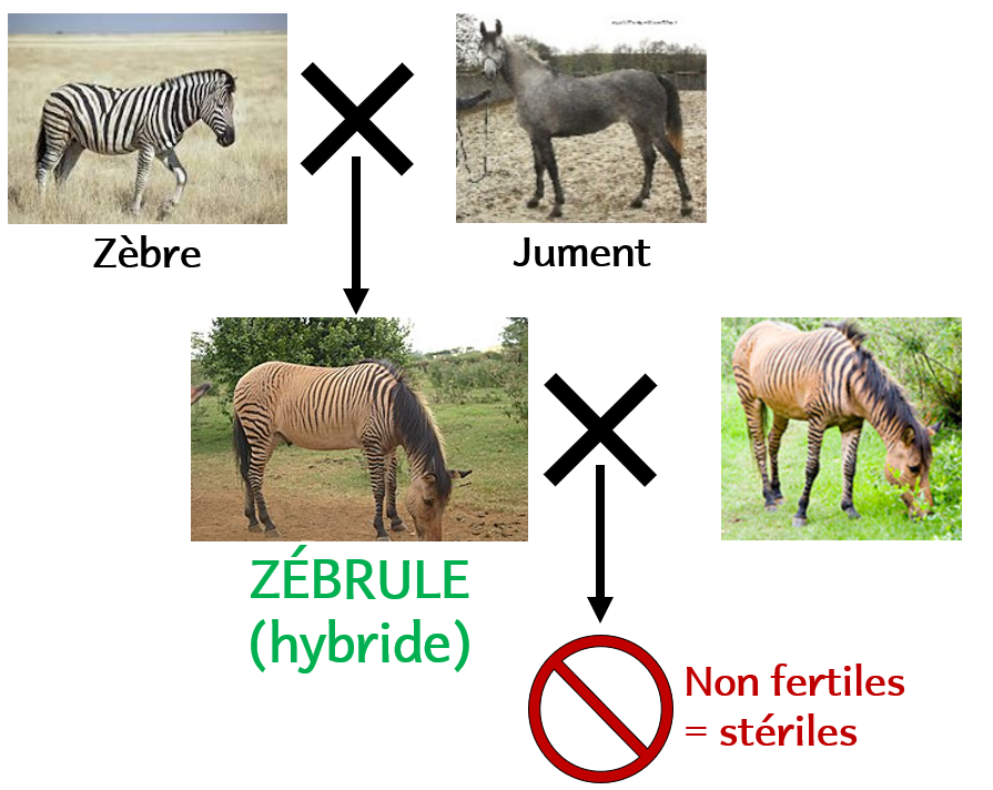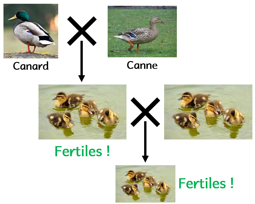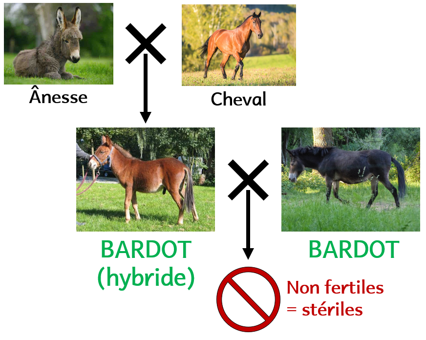 Testons cette nouvelle définition. Assumons que le cheval et l’ânesse sont d’espèces différentes. Ils se ressemblent un peu. Etant d’espèces différentes, ils ne devraient pas pouvoir se reproduire entre eux. Hors… ils en sont capables. On obtient un bardot (ou une mule suivant le sexe des parents). On appelle ces individus des hybrides. Les hybrides sont stériles : ils ne peuvent pas avoir d’enfants à leur tour.