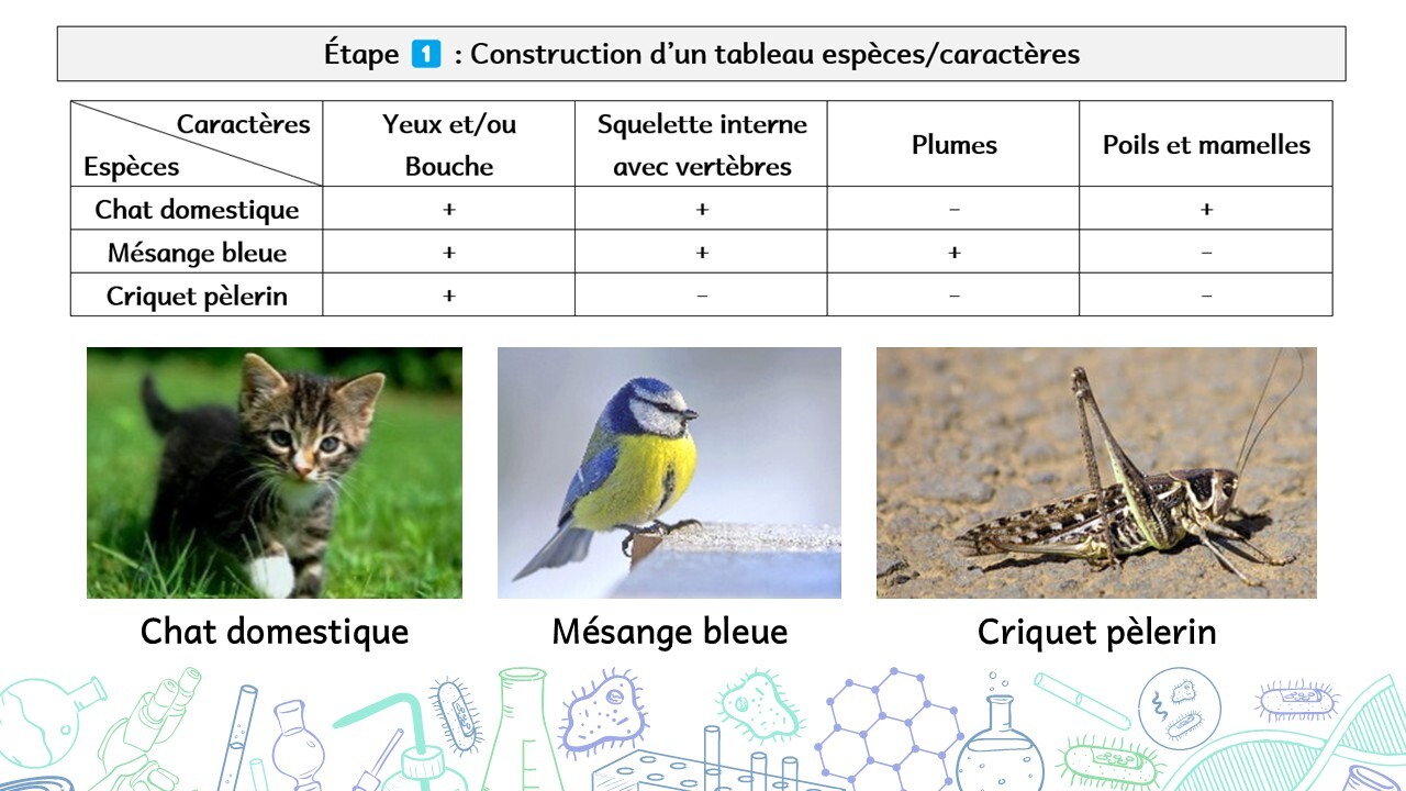 Étape 1 : On réalise un tableau où l’on place les différentes espèces étudiées. on indique si chauqe espèce possède ou non les caractères indiqués.