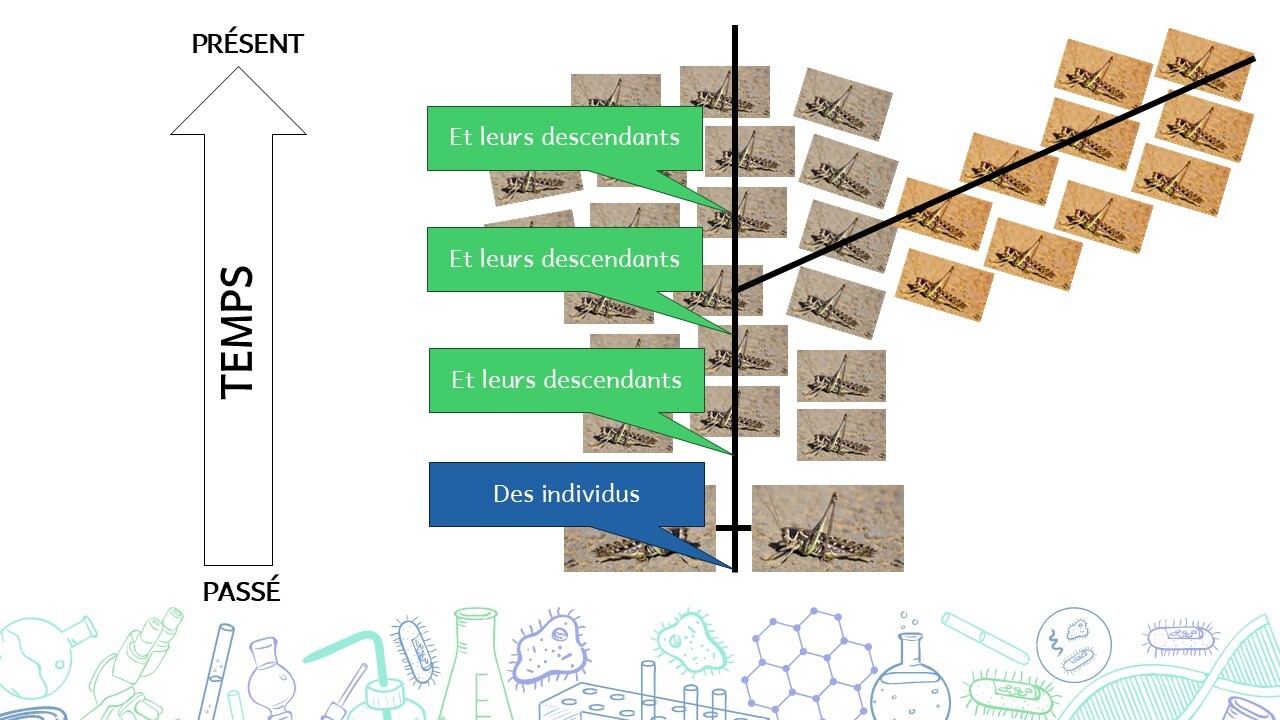On dessine donc un trait qui représente une lignée (= un très grand nombre) d’individus, et de tous leurs enfants/descendants.