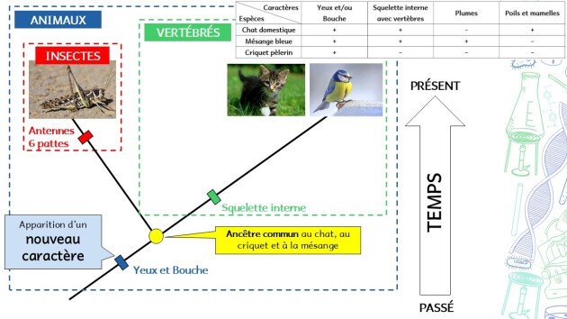 Un caractère partagé entre plusieurs espèces signifie qu’elles l’ont hérité d’un même ancêtre commun[1] (inconnu et disparu) chez qui cette innovation évolutive était apparue et qui a été transmise à tous les descendants de l’ancêtre commun.
