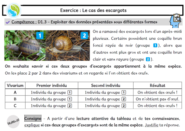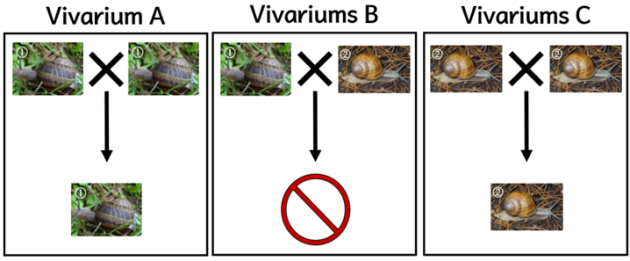 Les deux groupes d’escargots se ressemblent MAIS, dans le vivarium B, on voit qu’ils ne peuvent pas se reproduire entre eux.